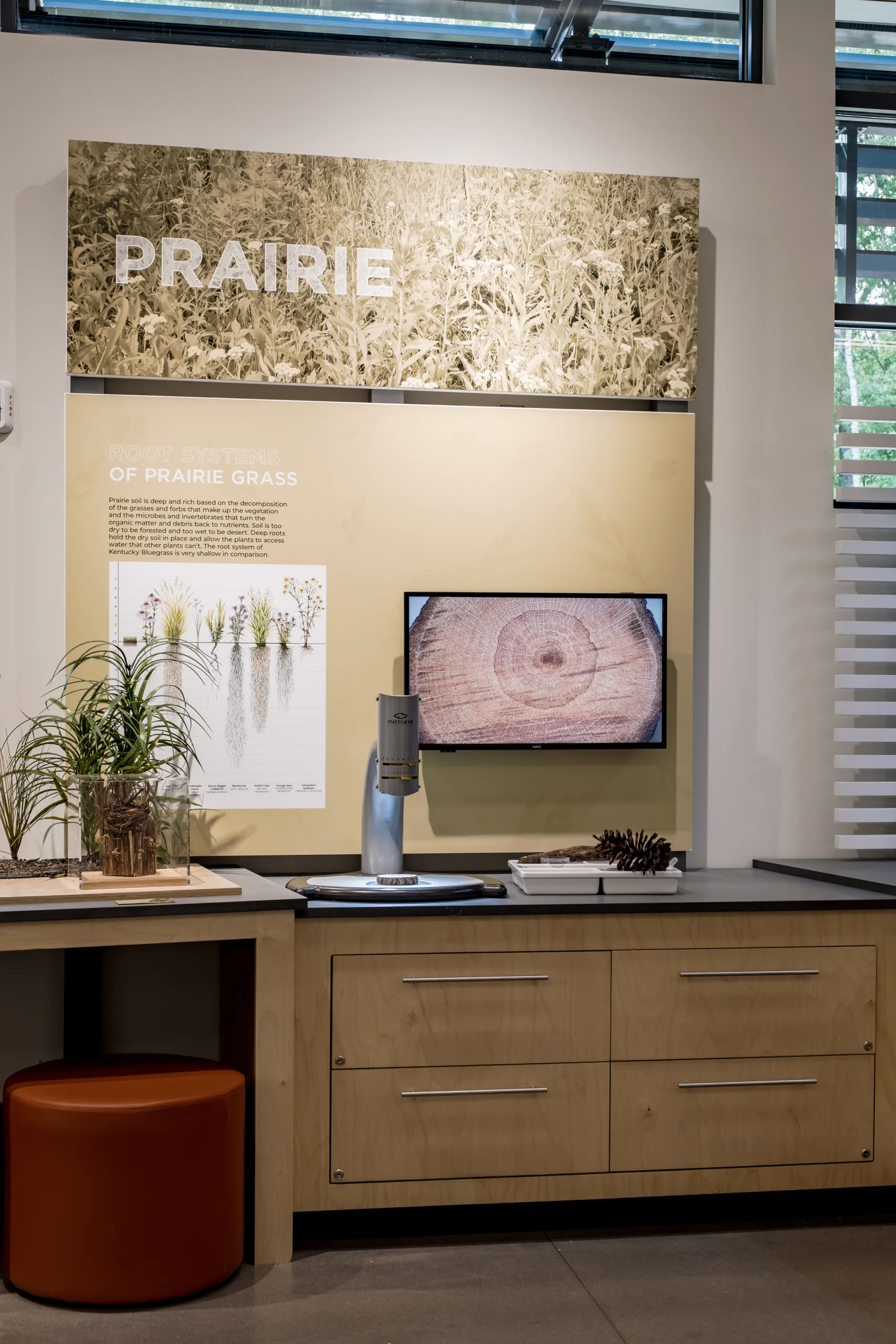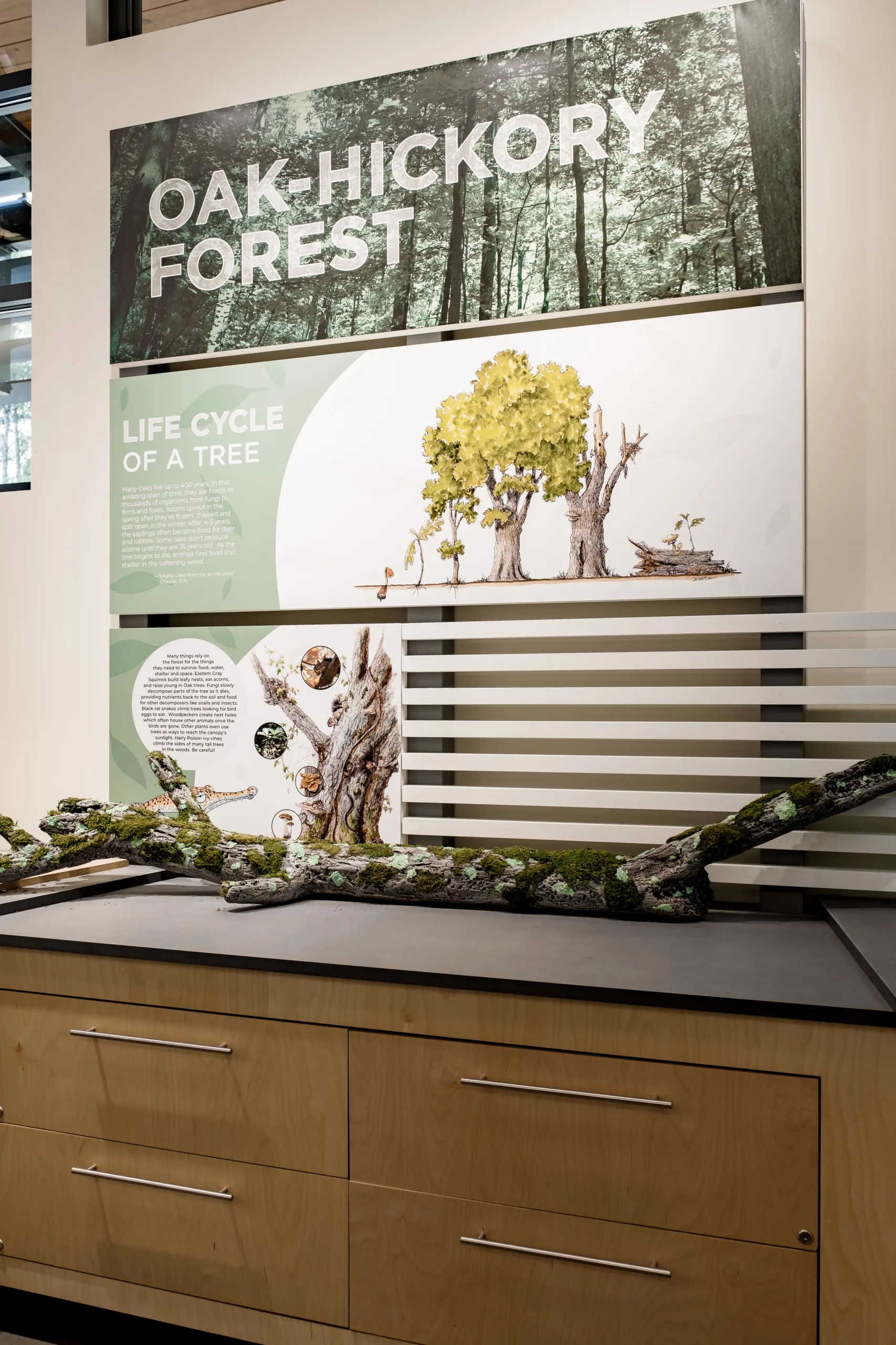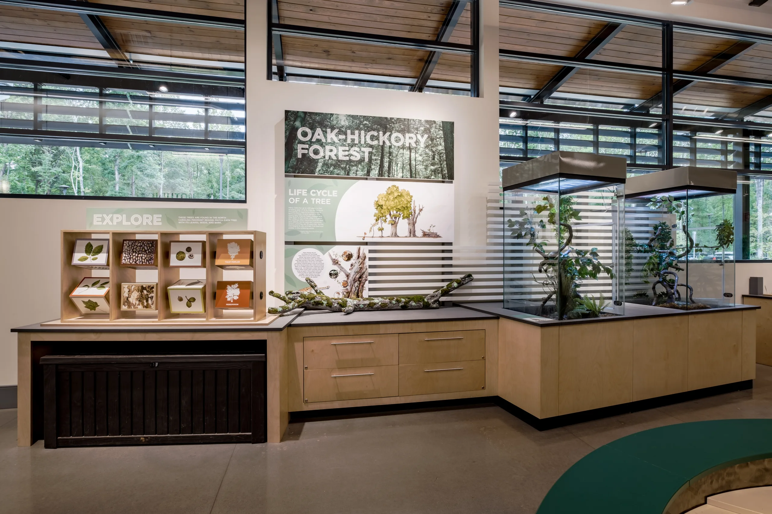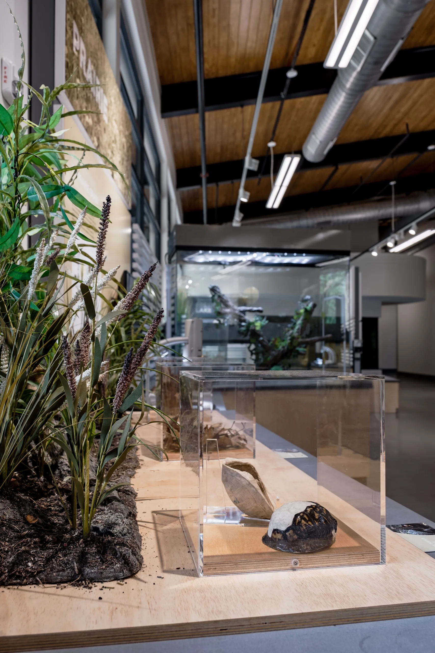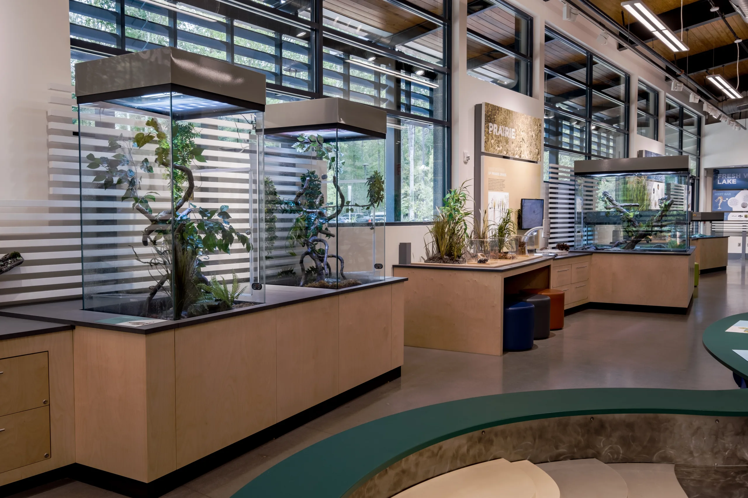 The exhibit also features an aquarium of native fish and dedicated habitats for turtles, snakes, and lizards, each tailored to the region’s ecoregions. Dynamic graphics and sleek display design tie the space together, creating a cohesive, engaging environment where visitors can connect directly with the natural world and the site’s unique history.