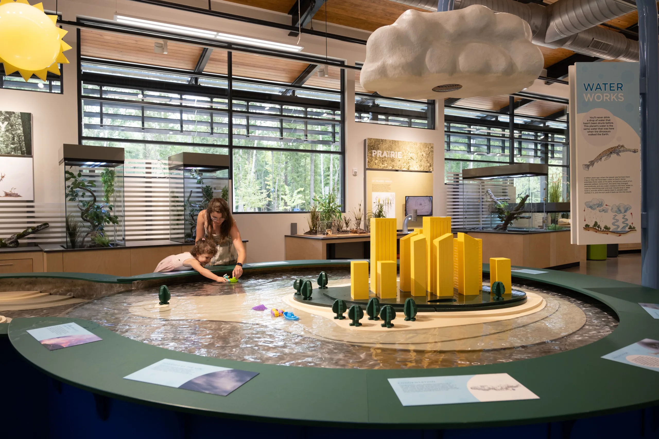 Two striking interactive tables serve as the heart of the space. One illustrates the water cycle with a whimsical cloud and miniature cityscape, while the other models nearby Mountain Island Lake, inviting visitors to explore familiar landscapes and discover new environmental narratives.