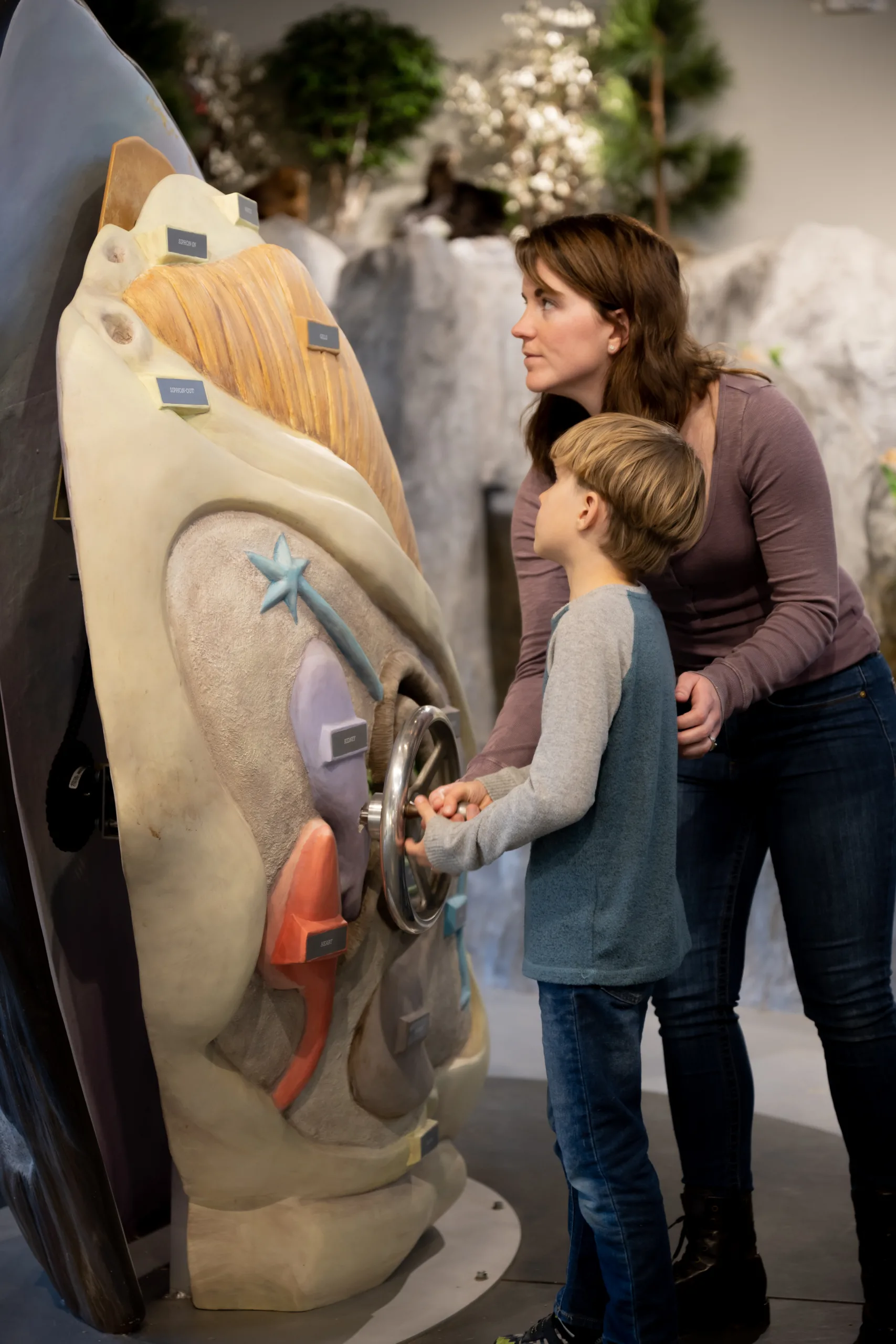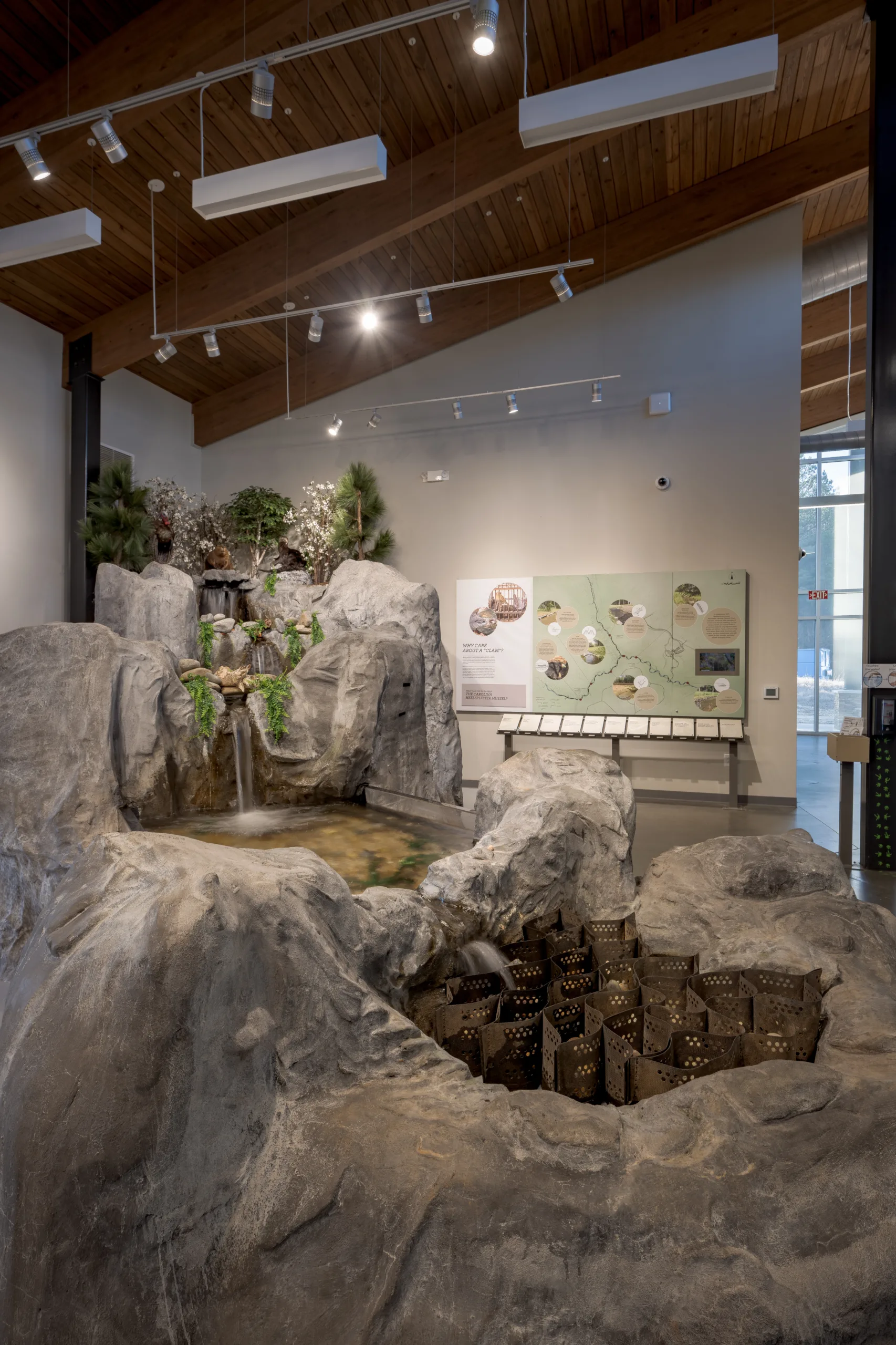 A suspended Pirate Perch fish, complete with detailed glochidia models, adds a whimsical and eye-catching focal point overhead. Together, these tactile, visual, and interpretive features create an engaging environment that encourages visitors to see, touch, and connect with the natural world.