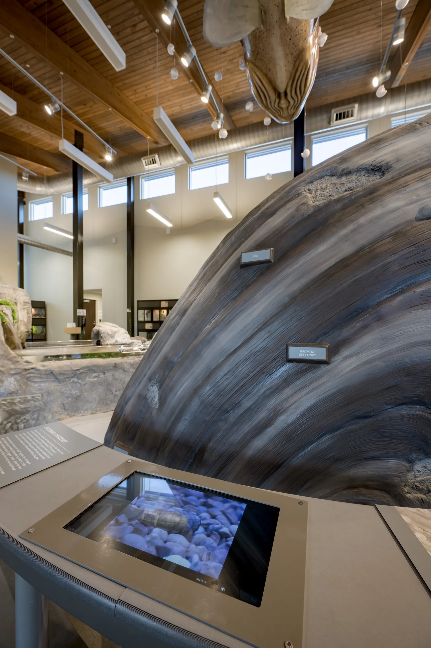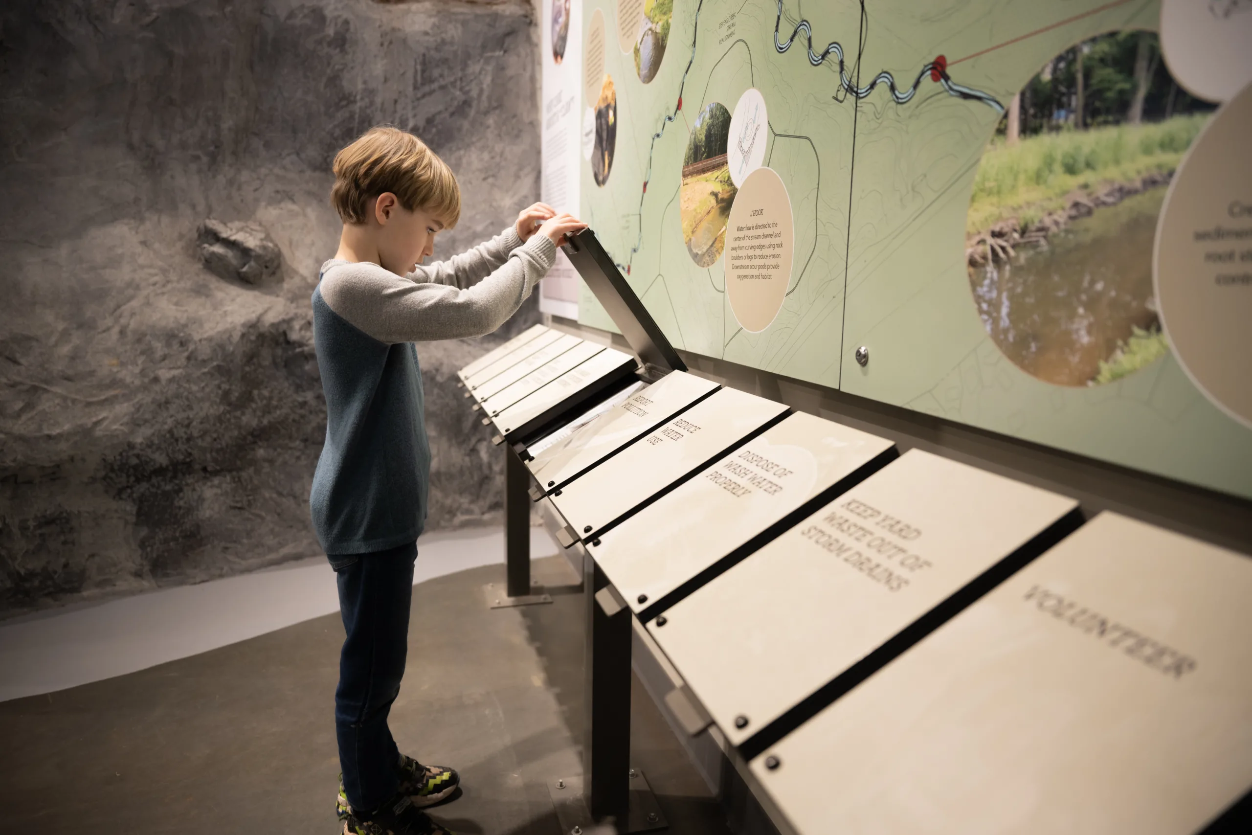 At the heart of the space are several immersive elements, including a touch tank modeled after a creek bed, a digital sandbox, and a large-scale model of a mussel that highlights the preserve’s aquatic life. Informative graphics and a biotic resources table offer opportunities for deeper discovery, allowing children and families to learn about the diverse ecosystems found throughout the surrounding landscape.