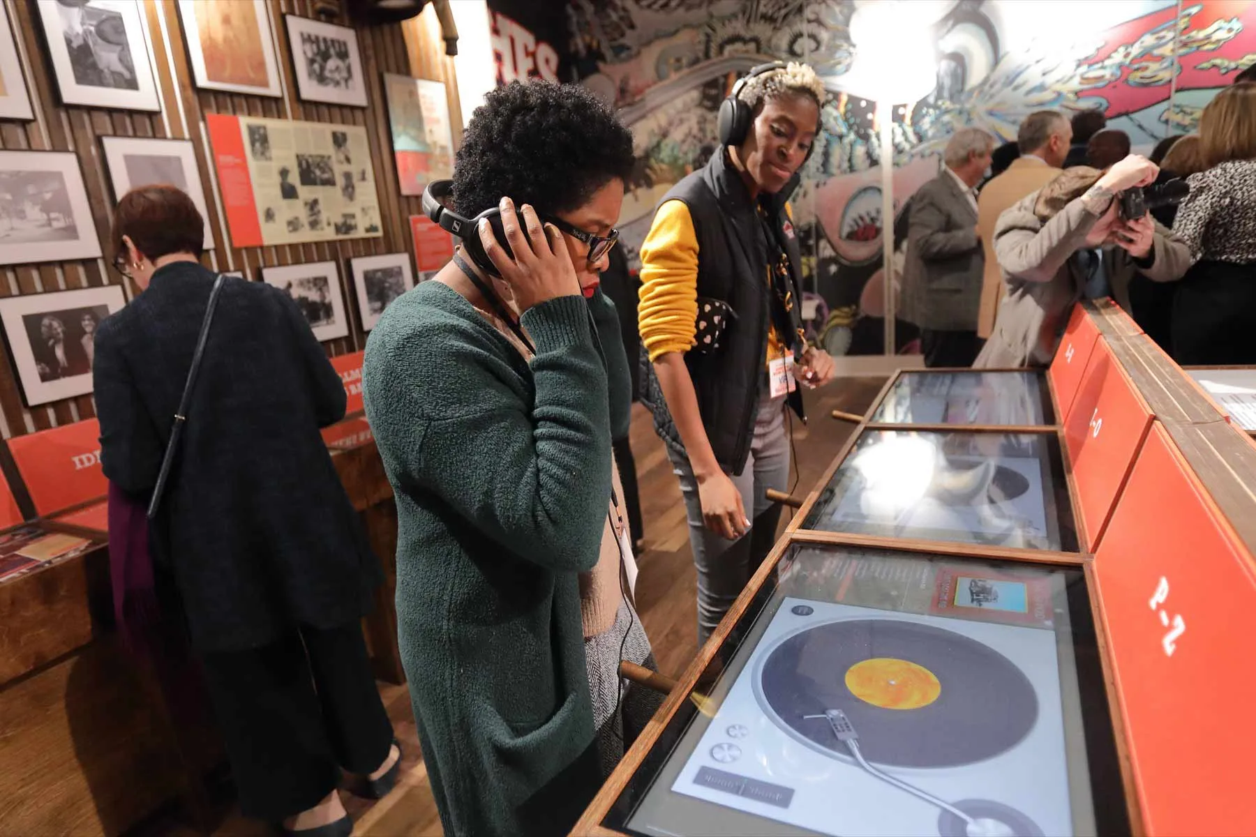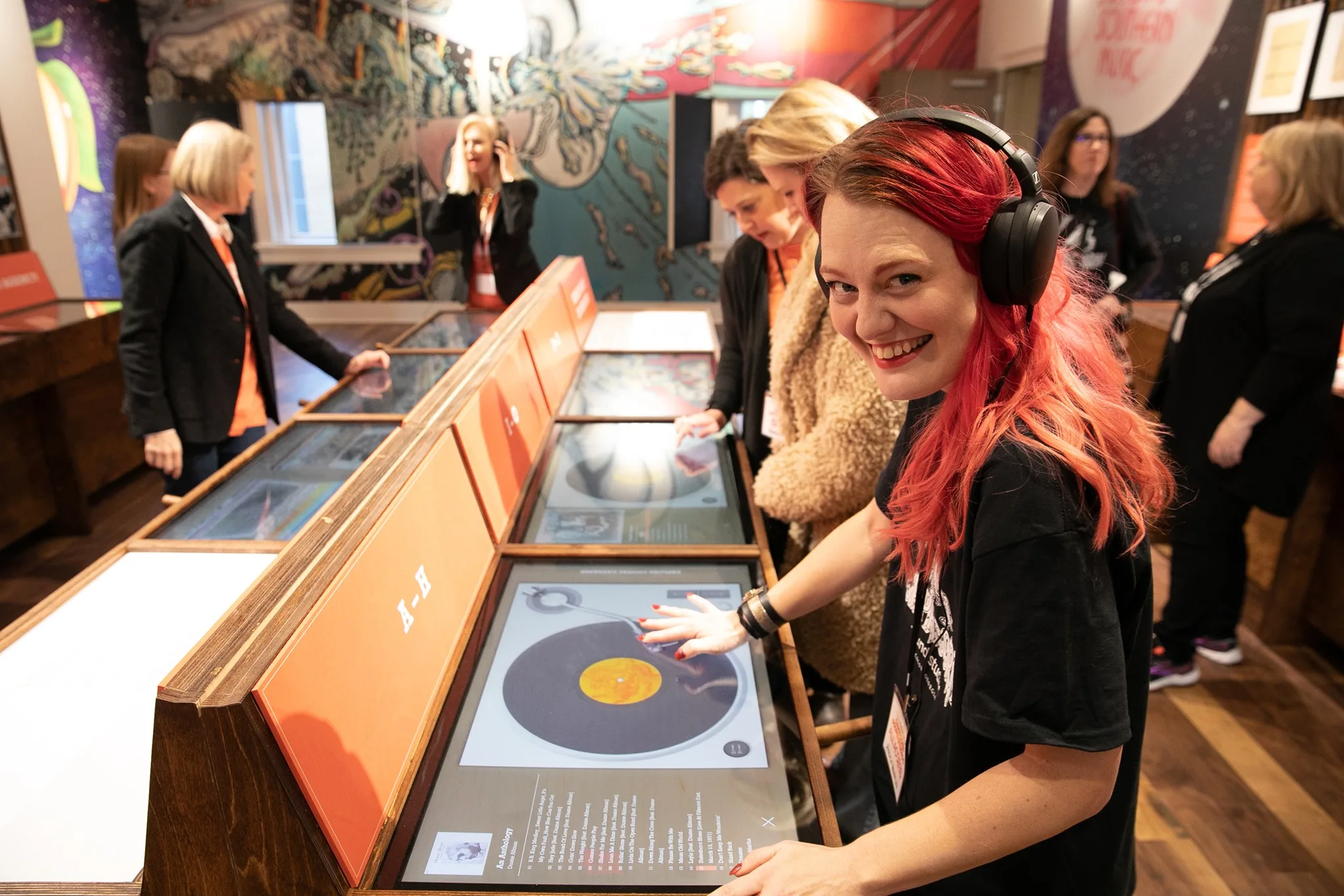 Visitors can flip through albums in interactive bins, cue music to play in the museum or on headphones, and engage with interactive record players that let them create their own personalized musical experience. The space features photographs, album art, posters, large-scale murals, and dimensional letters that evoke the energy and nostalgia of a favorite record store. A dedicated photo backdrop encourages social sharing and extends the experience online.