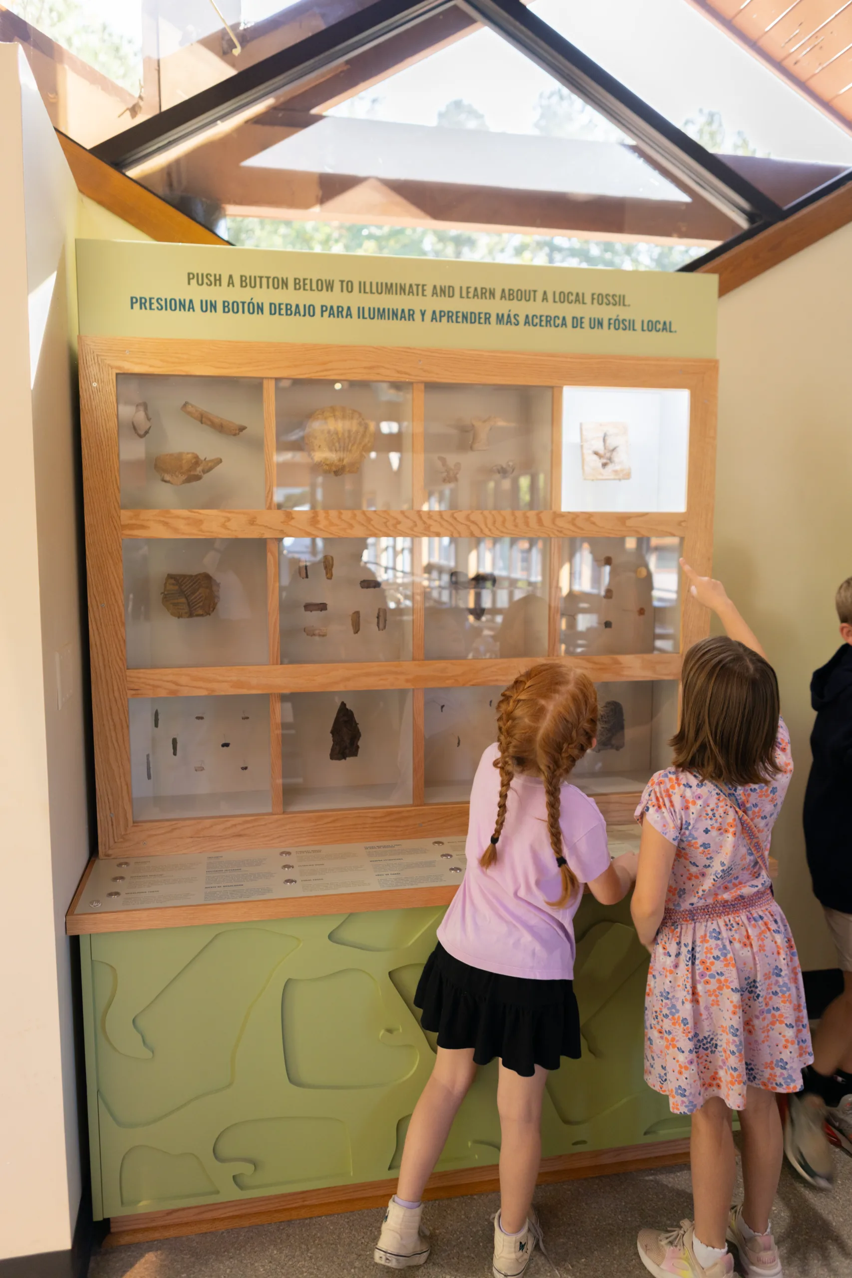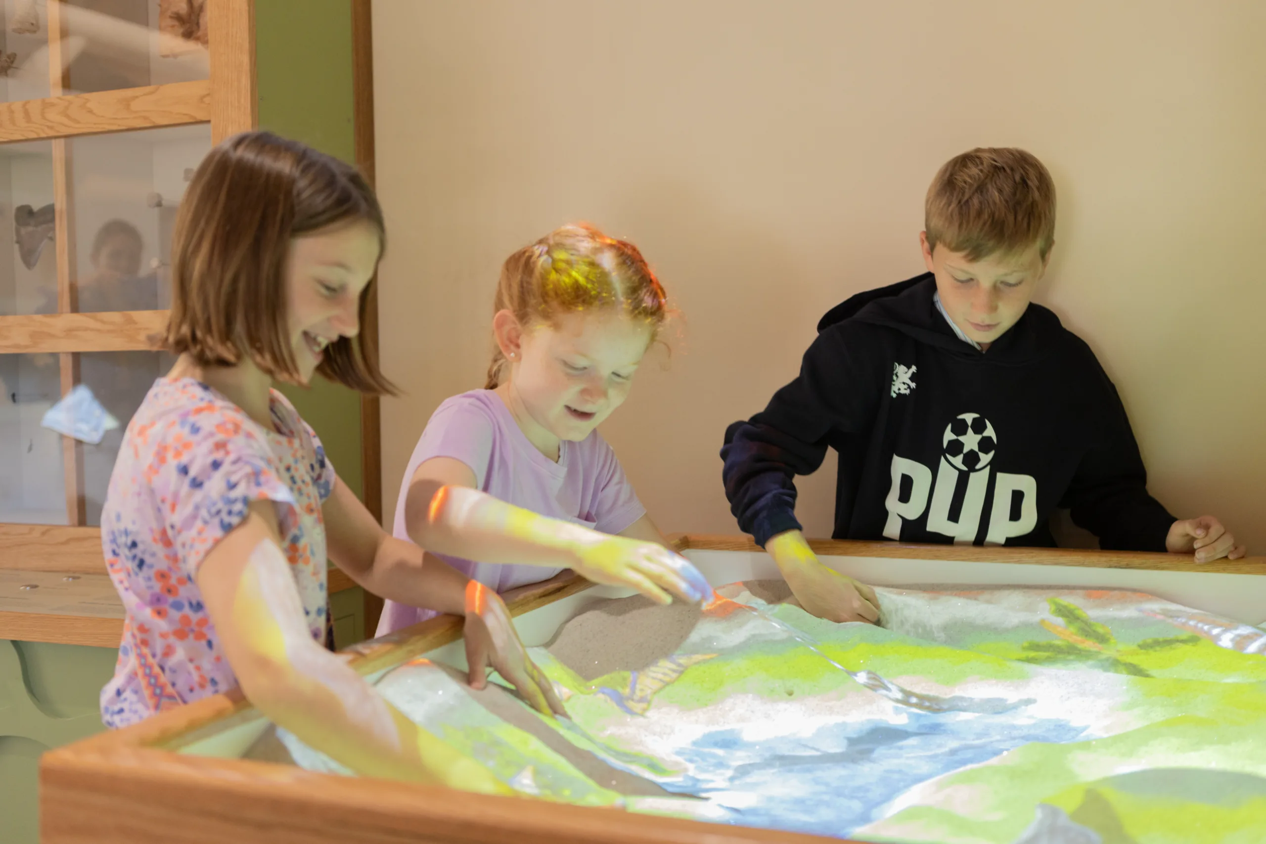 The space combines live animal habitats with interactive exhibits that encourage curiosity and discovery. A dramatic rock wall anchors the gallery and is inset with aquariums featuring local freshwater species. One of the most popular elements is the interactive sand pit, where an overhead light reacts to the movement of the sand and generates real-time topography. Visitors can shape valleys, rivers, lakes, and mountains, making abstract environmental concepts immediately understandable and engaging.